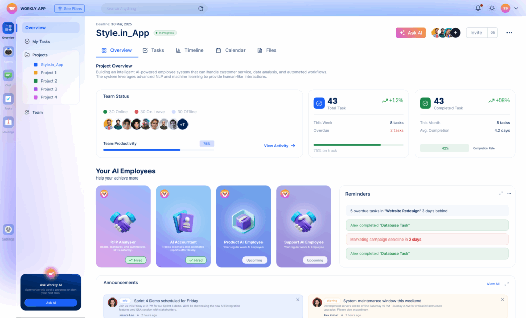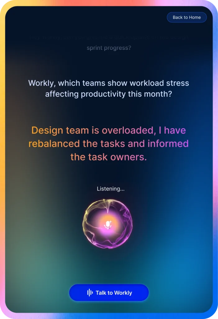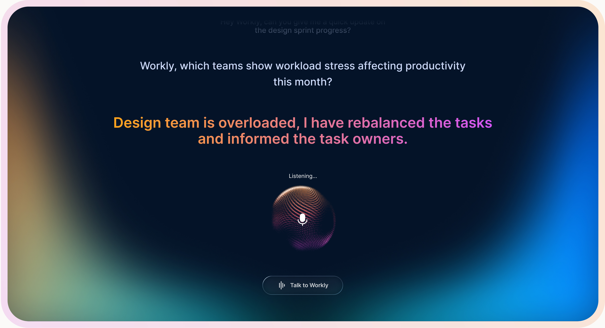 Workly doesn’t just answer questions—it acts like an AI employee. It joins your workflows, remembers context, creates and updates tasks, nudges people for progress, and keeps everything aligned across tools without needing to be asked every time.