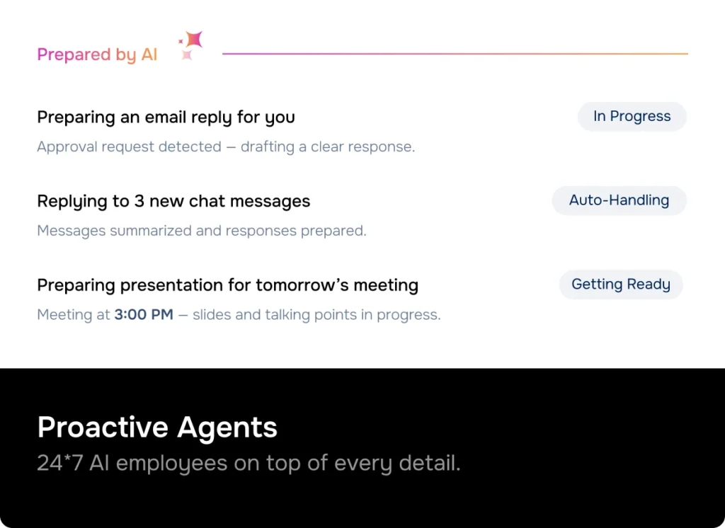 Give every team always-on, AI Employees that quietly handle the busy work—so projects keep moving even when no one is manually pushing them forward.
