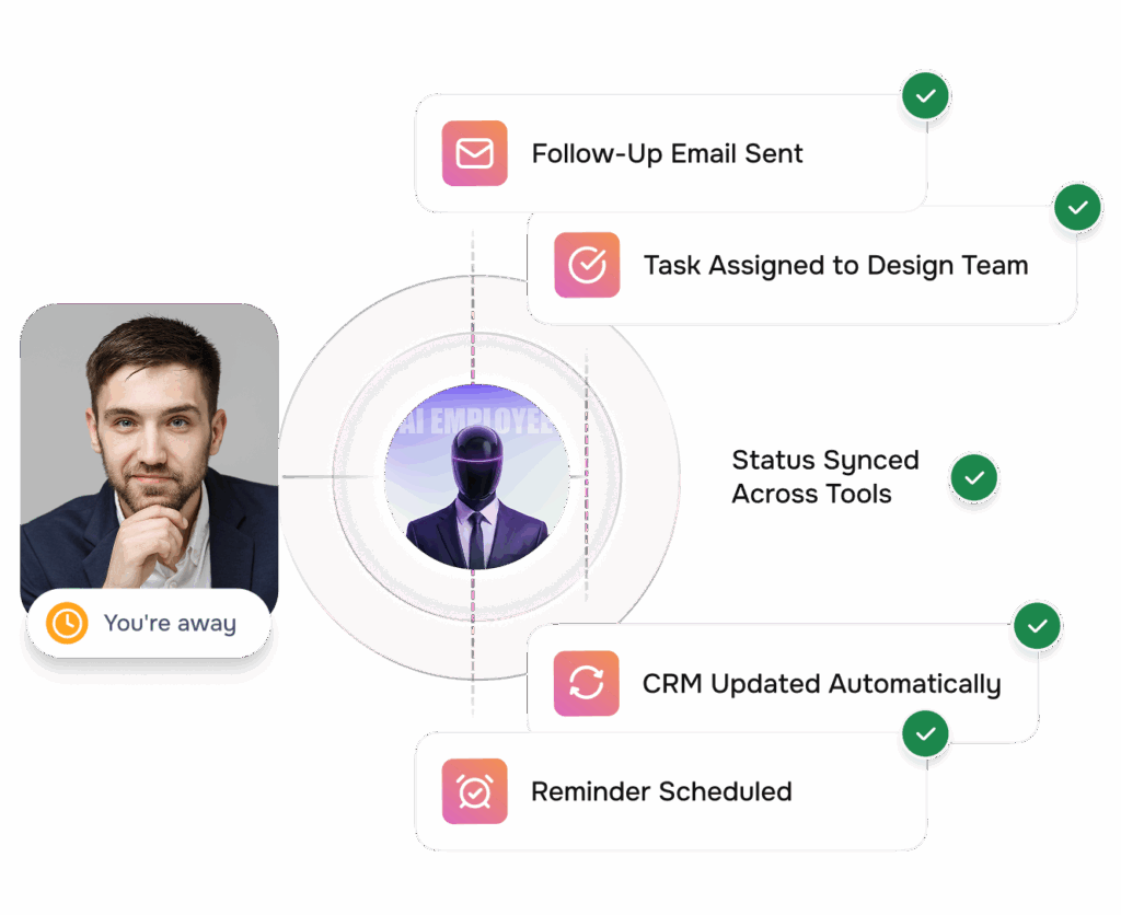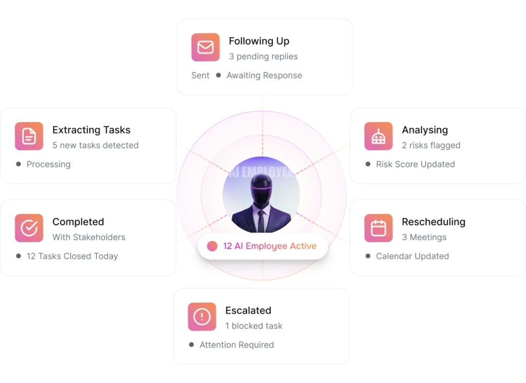 The AI Employee listens to team discussions, identifies action items, creates tasks, sends reminders, and tracks progress — so managers don’t have to manually follow up.