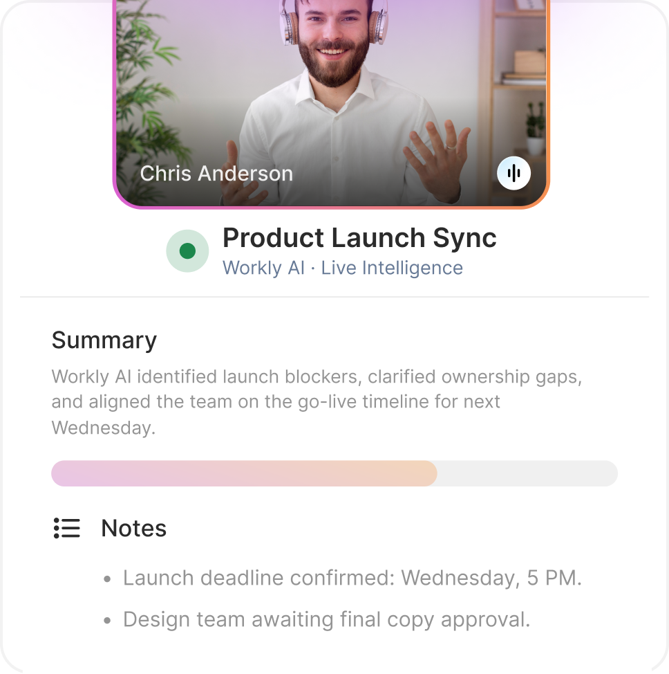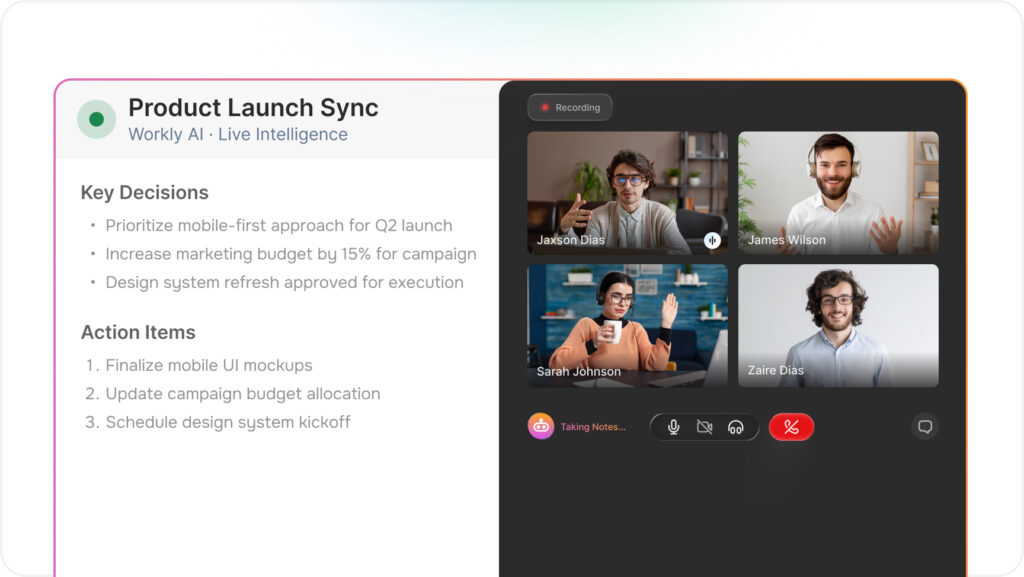 Workly AI records every meeting, extracts decisions in real-time, assigns tasks to the right people, and automatically updates your projects across all tools.