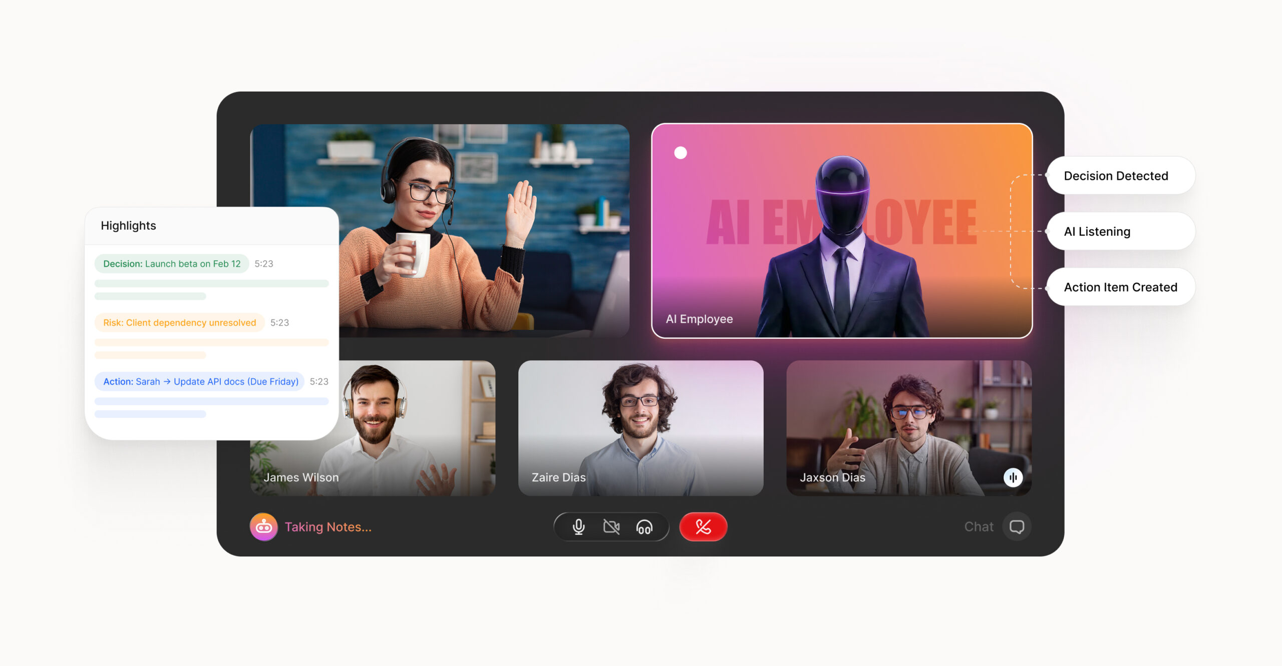 AI identifies decisions and next steps as the meeting happens.