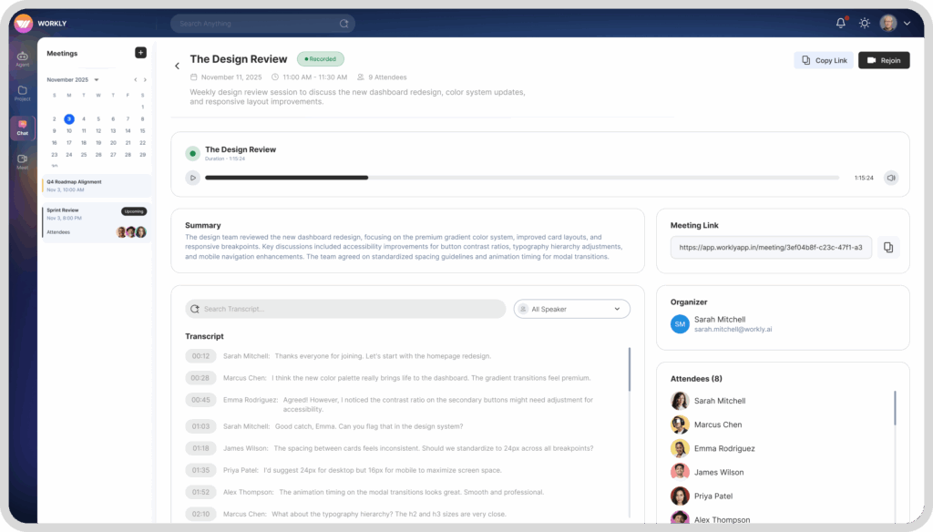 All meeting notes, recordings, and action items are automatically saved to your Workly workspace. You can access them anytime from the meeting history, share them with teammates who couldn’t attend, or reference them later for follow-ups.